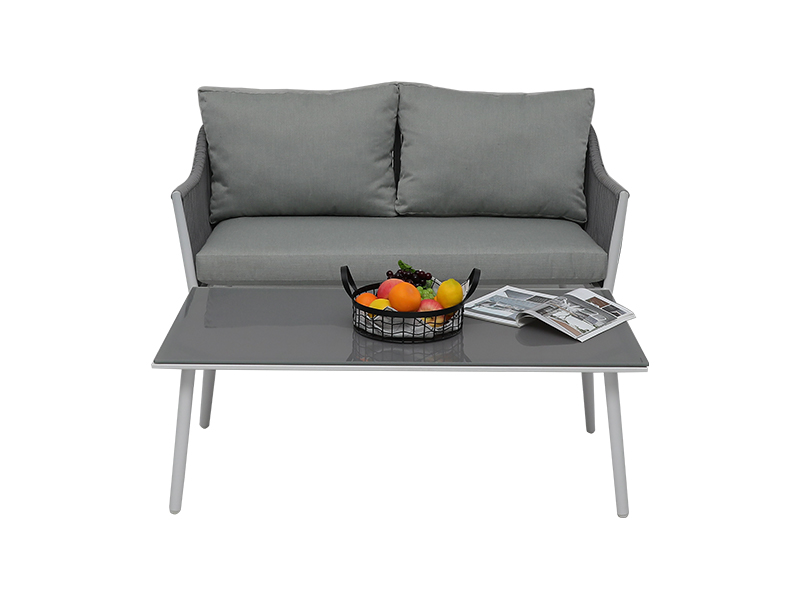 | Erittely | alumiinirunko köydellä kudottu, yhteensä 4kpl; loveseat: L75*L135*K76cm, 1kpl yhden tuoli: L75*L75*K76cm, 2kpl sohvapöytä: L114*L60*K38,5cm, 5mm karkaistu harmaa lasi, 1kpl |